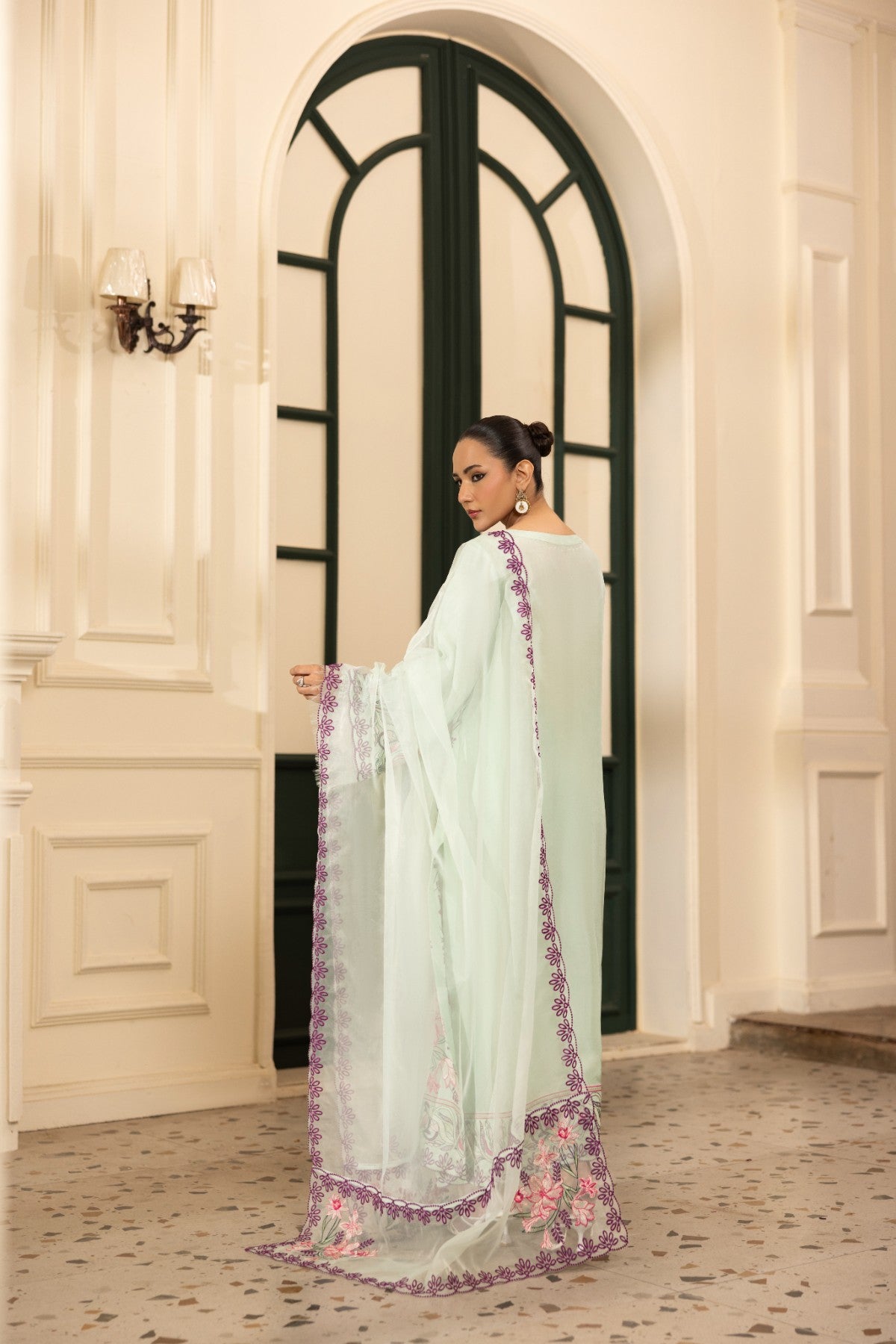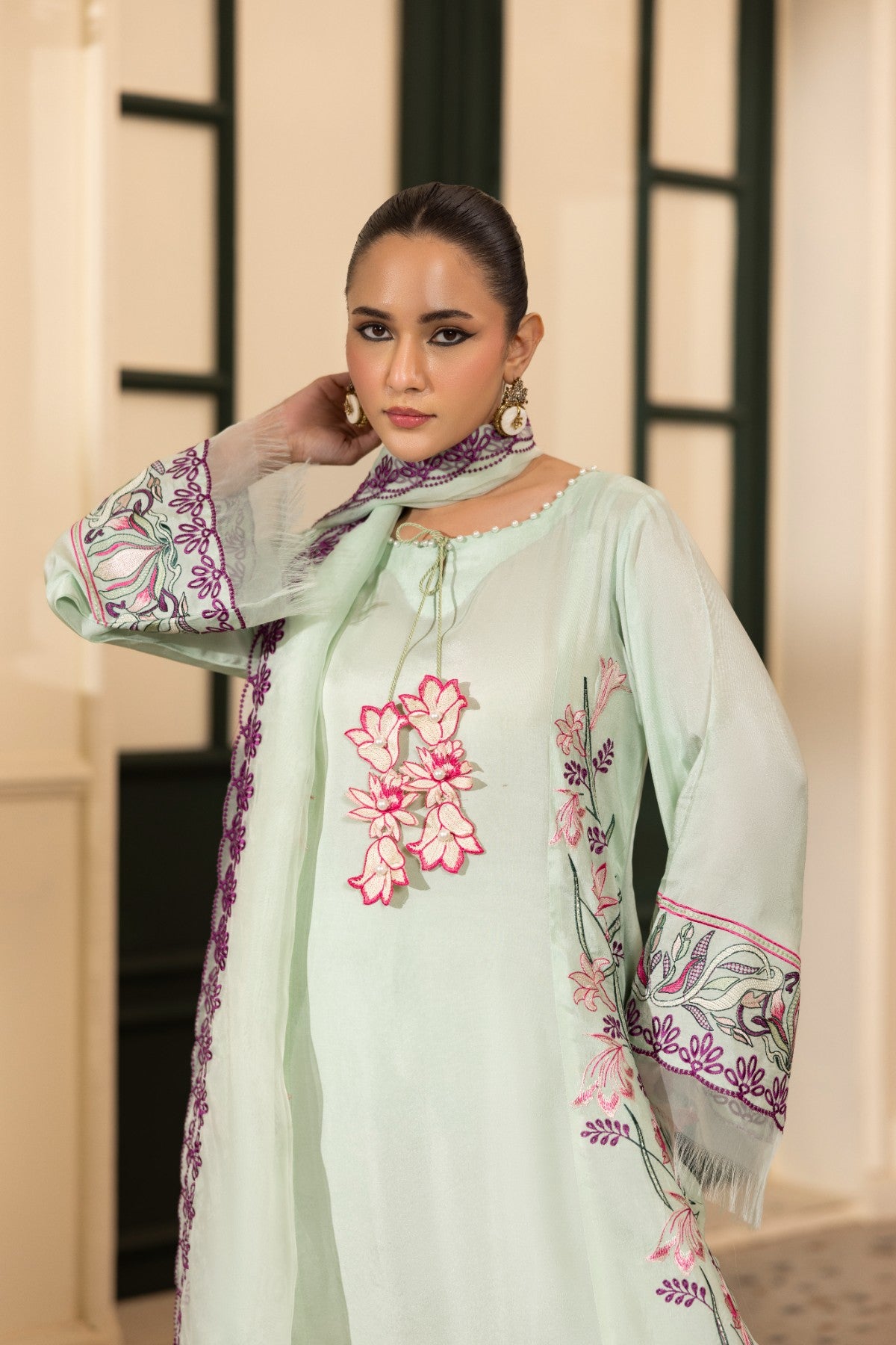 Step into soft sophistication with this elegant pista ensemble designed to give you a fresh and graceful look. The delicate floral accents and refined detailing make it perfect for festive lunches, intimate gatherings, and special occasions.