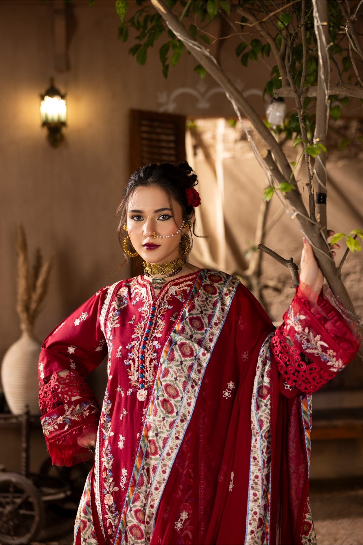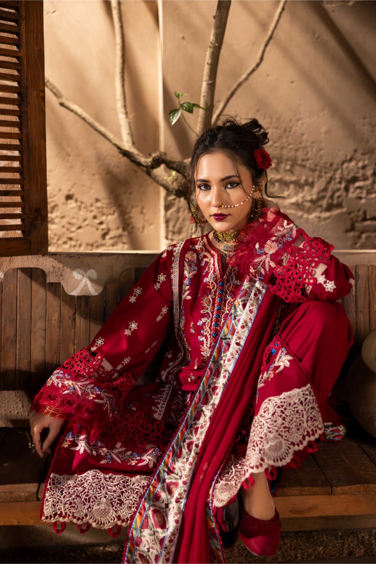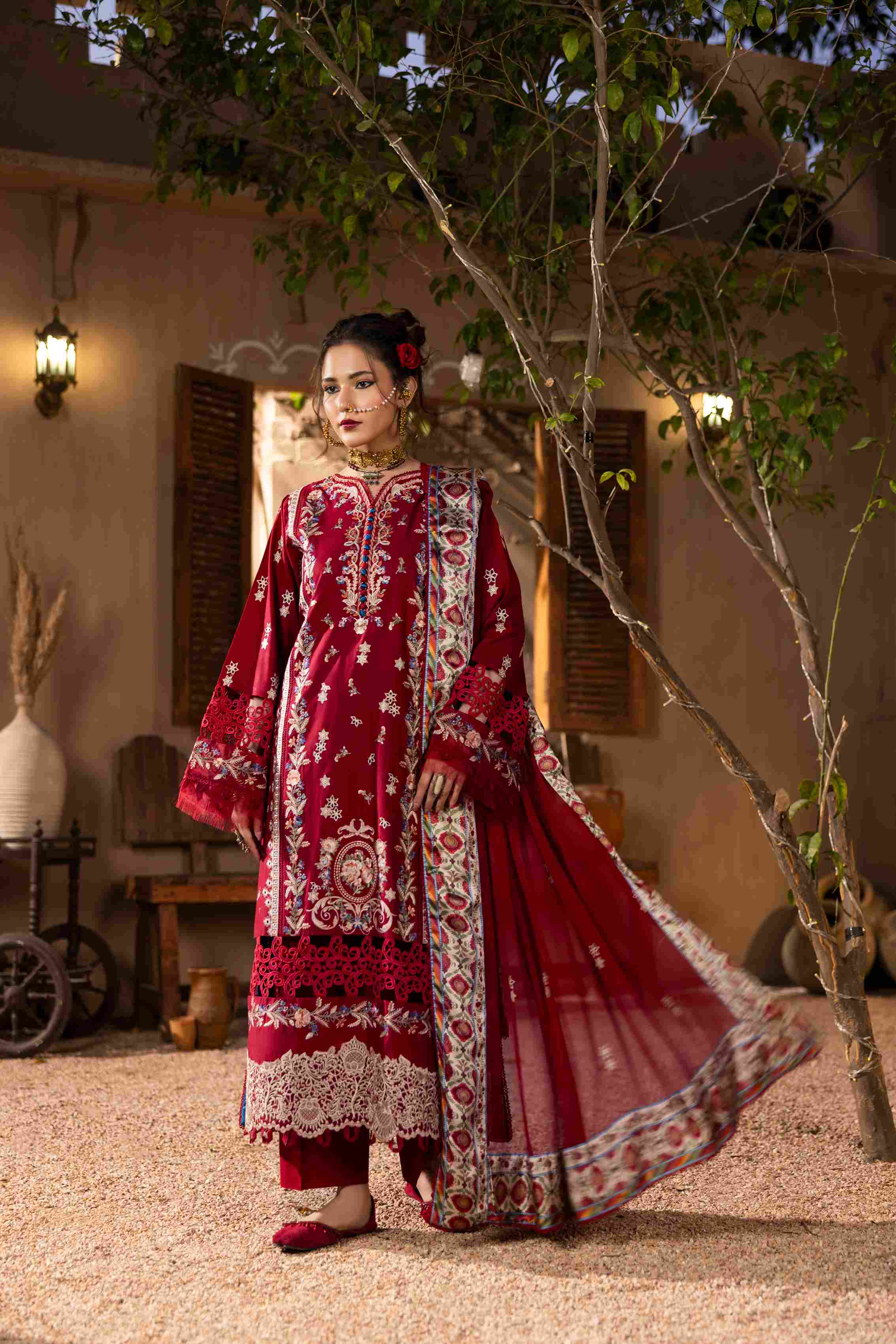Step into every occasion with confidence in this striking red ensemble. Designed for women who love elegance with a festive touch, this outfit perfectly blends intricate craftsmanship with a graceful silhouette.